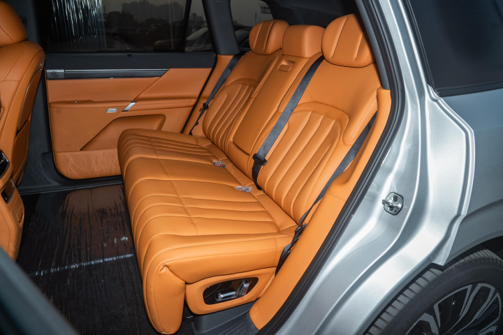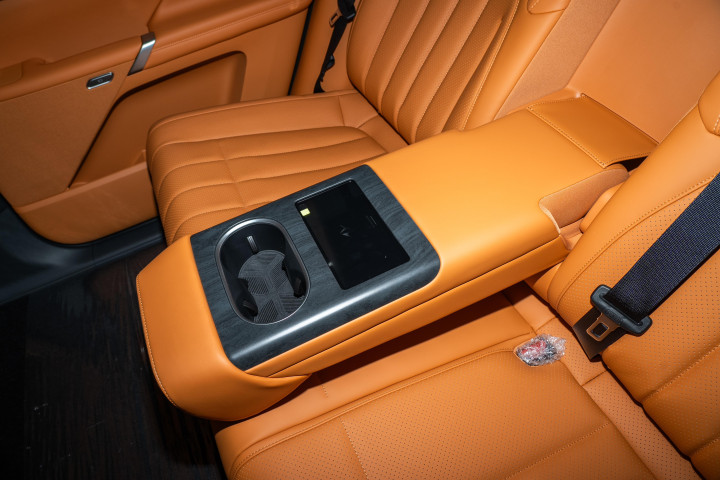第二排电动魔毯座椅功能丰富,四分、六分腿托可独立调节,乘客能按需调整角度与长度;靠背角度支持电动无极调节,可后调 9 度至最大 36 度,调节方式包括按键、6.92 英寸二排智能扶手屏及中控屏。扶手屏集成空调、座椅、遮阳帘、娱乐屏、媒体音量、氛围灯控制,还配备 Type-C 接口,后排乘客无需依赖前排即可完成多数舒适设置。第二排可选装加热功能,冬季使用更温暖;后窗侧遮阳帘为选装,夏季能遮挡强光,提升后排舒适度。