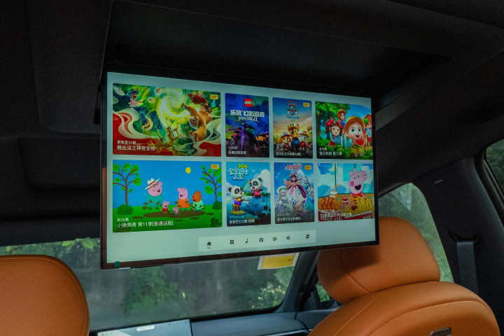 后排娱乐配置可提升乘坐体验,该车标配 15.6 英寸后排娱乐屏,可选装升级至 21.4 英寸。21.4 英寸版本分辨率 3K(3036×1708),屏占比 88.5%,超窄黑边、超薄设计,操作流畅且功能丰富。娱乐屏搭载腾讯视频、哔哩哔哩等多平台,配合 WANOS 全景声 18 扬声器 7.1.2 环绕音响,后排视听体验较好。曾带孩子短途旅行,孩子通过娱乐屏看动画不吵闹,便于专注驾驶;此外支持 OMS 手势控制,具备儿童监测功能,能自动开启儿童模式限制不适内容,家长更放心。