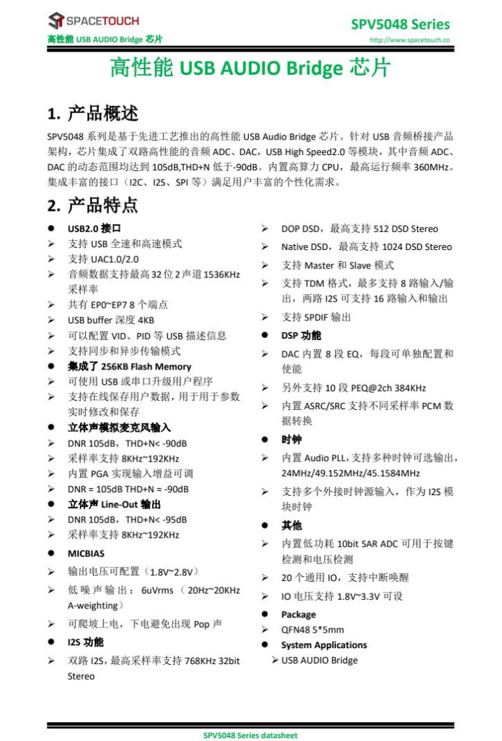 SPACETOUCH普林芯驰SPV5048高性能USB AUDIO Bridge芯片。SPV5048系列针对USB音频桥接产品架构,芯片集成了双路高性能的音频ADC、DAC,USB High Speed2.0等模块,其中音频ADC、DAC的动态范围均达到105dB,THD+N低于-90dB。内置高算力CPU,最高运行频率360MHz。集成丰富的接口(I2C、I2S、SPI等)满足用户丰富的个性化需求。